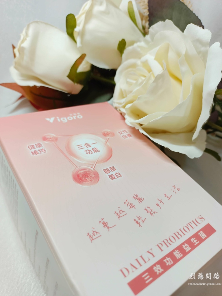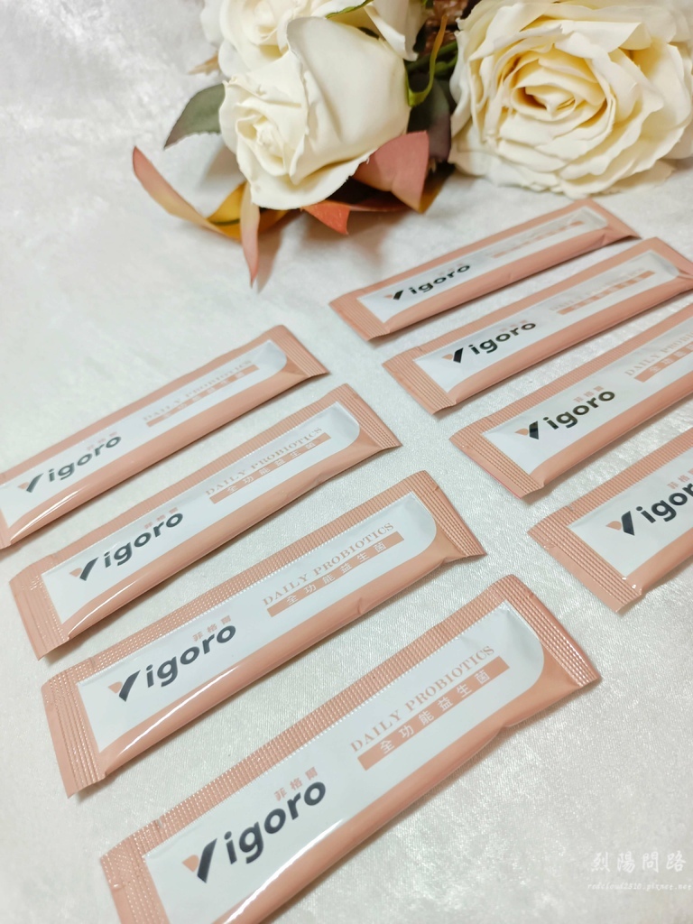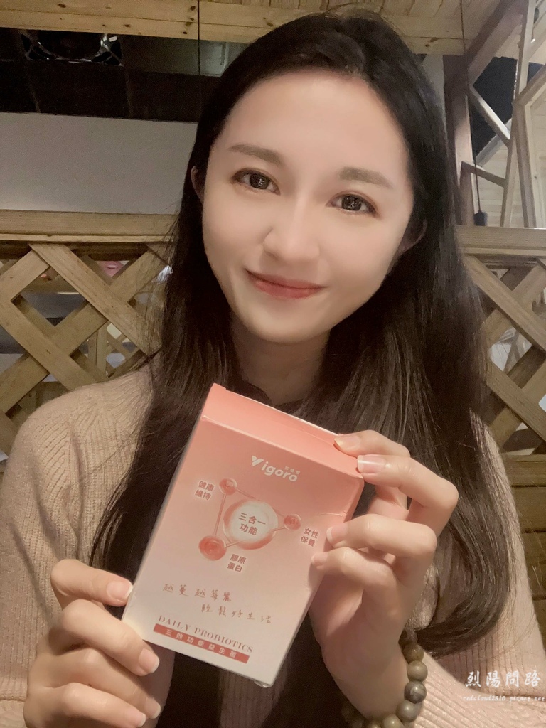 膠原蛋白:Vigoro菲格爾三效功能益生菌是蔓越莓口味,甜甜的很好吃,烈陽每天都會吃一包,可以幫助調節生理機能、養顏美容、維持青春美麗。