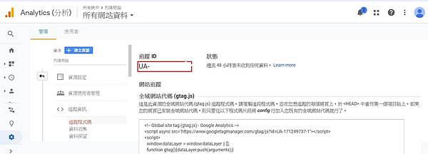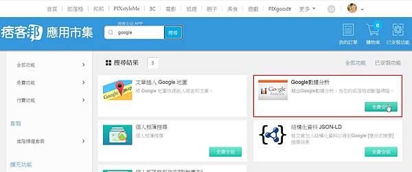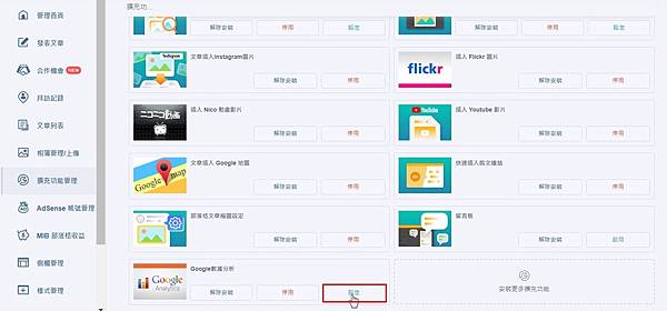 8.之後回到痞客邦後台擴充功能管理,找到google analytics選擇設定,輸入追蹤ID