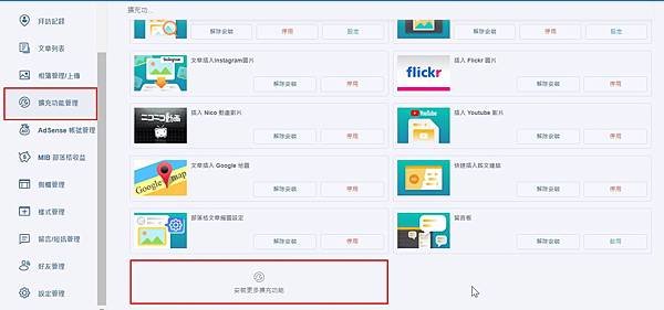 6.到部落格後台,點選擴充功能管理,再點選安裝更多擴充功能