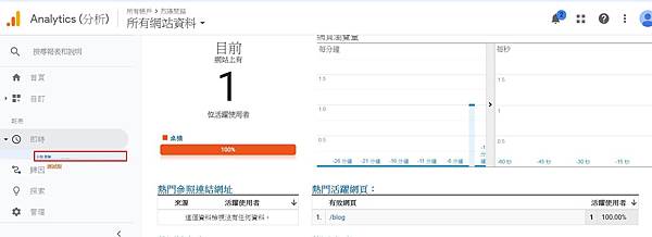 9.回到google analytics帳戶點選報表>即時>總攬,就能看到報表囉!!自己可以嘗試登錄痞客邦試試,就會有瀏覽人次1