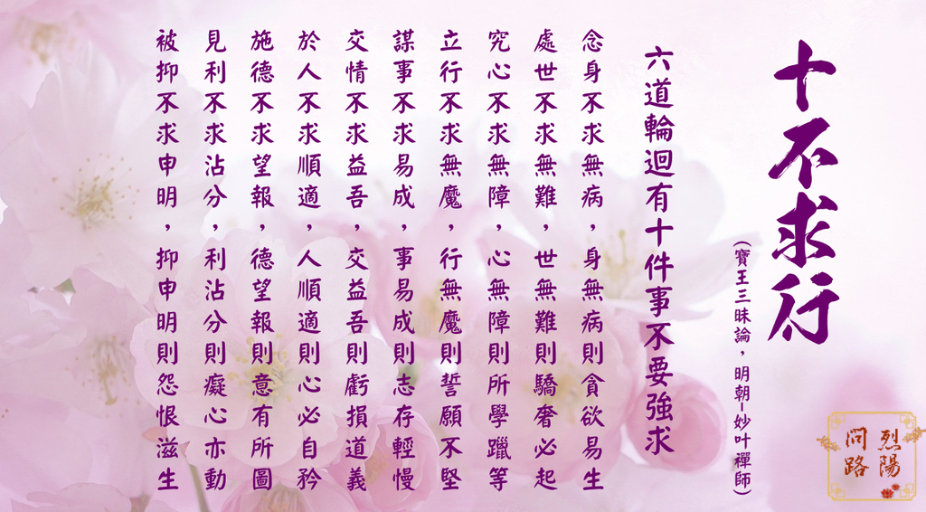 為什麼在圓滿的佛性裡頭還有無奈?這裡要談十不求行(寶王三昧論,明朝-妙叶禪師)。有十件事不要強求、奢求,六道輪迴就有很多莫可奈何。